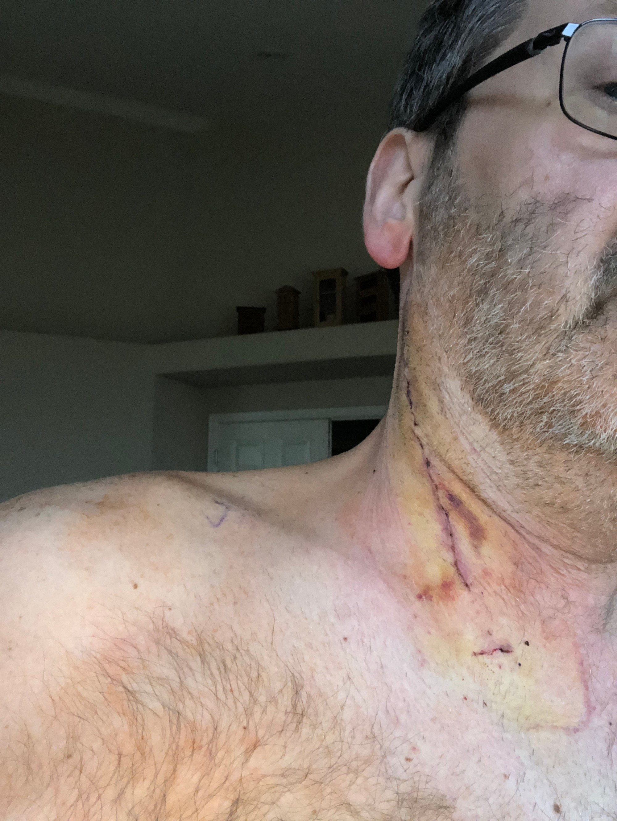 So I went into the hospital for what I thought was just a bottle brush cleaning of the vein in my neck. When I got the bandage off what you see above is what Dawn saw .