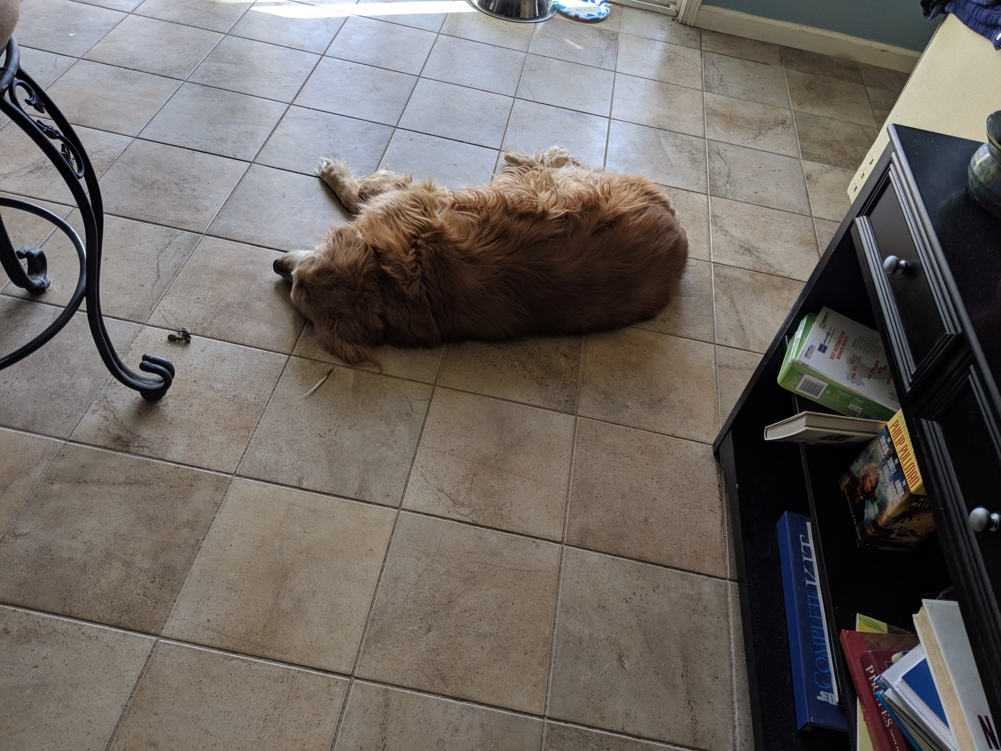 So it seems a plan that dogs have to block as much space as possible no matter where they lay down. The space between the sofa and the counter has got to be 4 feet and he Lay’s directly in the center leaving 6 inches on each side.
